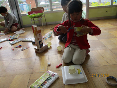 お菓子の箱やカップなどの廃材や画用紙などを自由に使って自分の作りたいものを作りました。おもしろい発想でいろんなおもちゃができました。