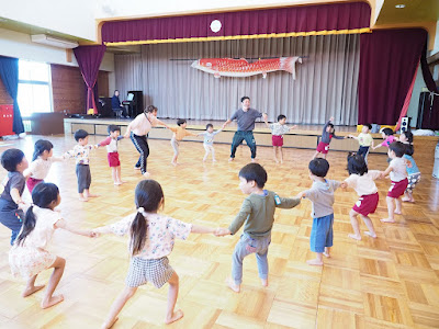 リズムの後はお楽しみの玉入れ大会。男の子対女の子はなんと引き分けでした。子ども対先生はどうだったのかな?