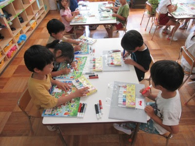 屋台に乗せるミニミニ自分を作りました! 服はお祭りっぽくしたいから……と子どもたちが言っていたので、にじみ絵でミニミニ自分の服を作りました。