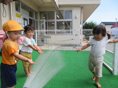 外でたくさん遊んだあとは、水遊び。ホースの水に大喜びでした。水の冷たさが気持ちよかったね。