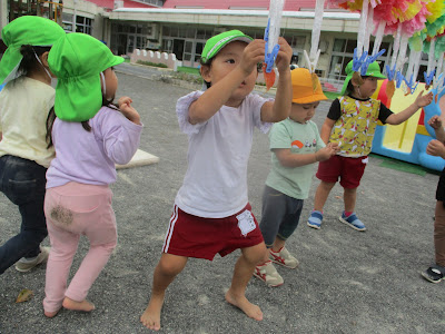 竿に葉っぱを付けて葉っぱ取り競争にしました。「もう1回」と取った葉っぱを自分で付け直し、何度も走る様子もありました。最後はたけ組さんが「手伝ってあげる」と竿を持ってくれたり、戸板のそばで応援してくれたりしました。優しいたけ組さん、「ありがとう」でした。うれしいね‼